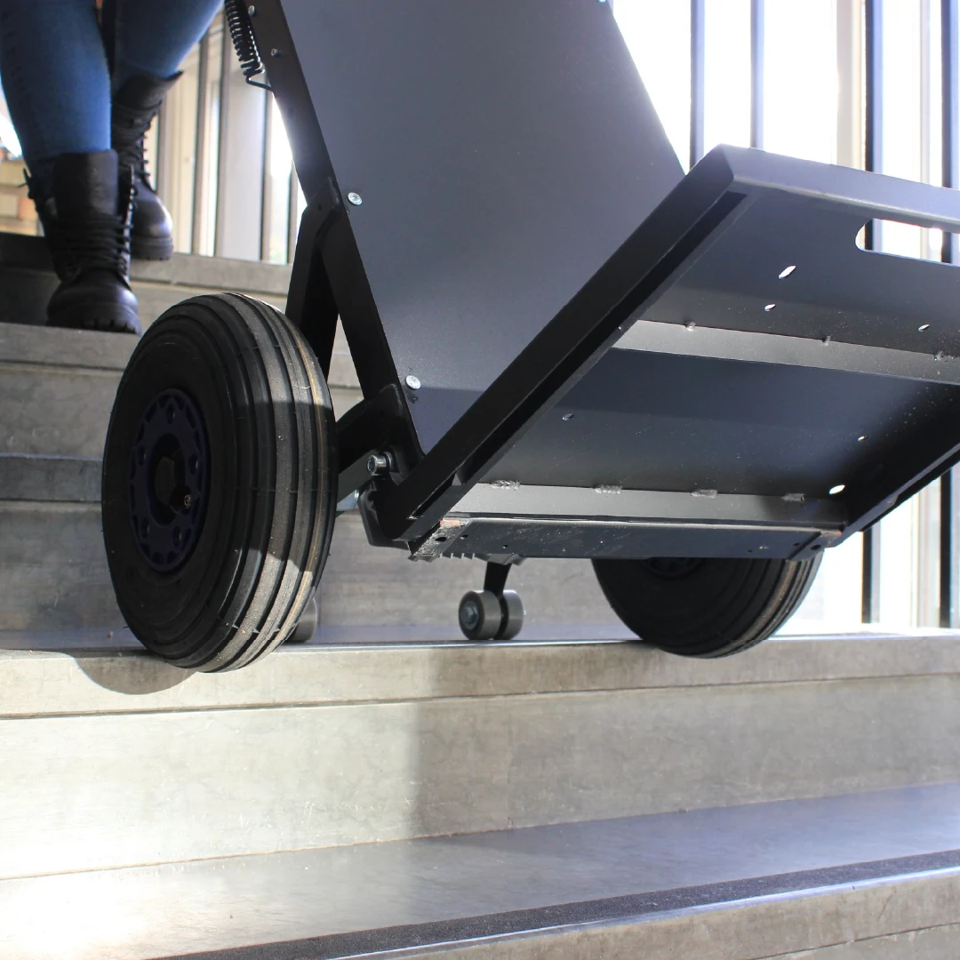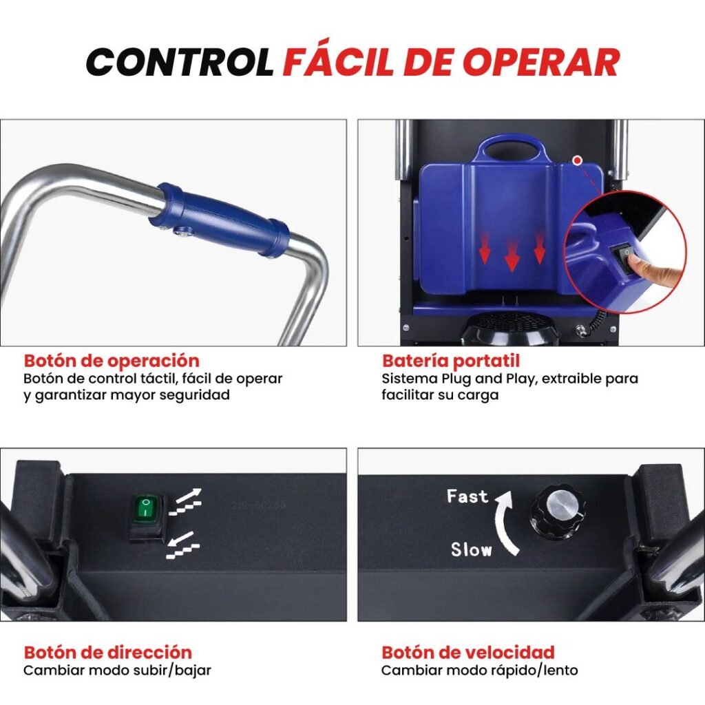 Su batería portátil garantiza autonomía y libertad de movimiento, mientras que los botones de dirección permiten subir o bajar escaleras con un simple toque. Además, el botón de velocidad ofrece control total, adaptándose a las necesidades del operador y al entorno.