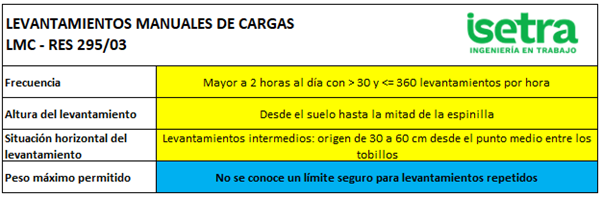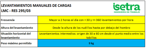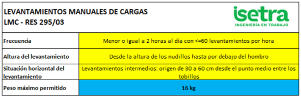 Para responder esta pregunta nos valemos de la planilla que les dejo aquí donde podrán contestar esta pregunta utilizando el método LMC de la res 295/03. ¡Atención! todos los pesos que por tabla son mayores a 25kg los reemplacé por 25kg, esto es mi criterio profesional para que en ningún caso se pueda levantar más de 25kg.