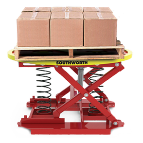 Para puestos que trabajan con apiladores o autoelevadores, las mesas autonivelantes neumáticas o a resortes son una gran solución. Estas mesas permiten girar el pallet con mínimo esfuerzo, evitando que el trabajador deba caminar alrededor del pallet y así ganamos productividad y menor cansancio para el operador. Estas mesas autonivelantes son más económicas que las tijeras eléctricas de elevación.