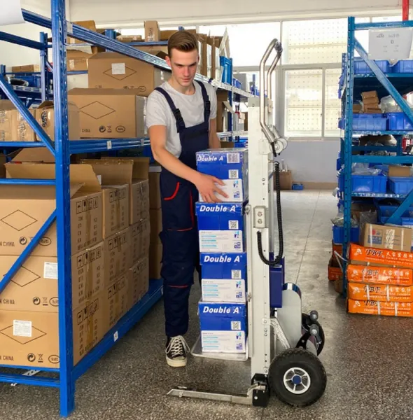 Distribuir mercancías pesadas, subir y bajar escaleras, obstáculos, transporte plano, cargar y descargar mercancías, subir y bajar del vehículo, subir y bajar de la plataforma, también se puede utilizar para diversos escenarios de manipulación de materiales, como almacenes, supermercados, fábricas y camiones.